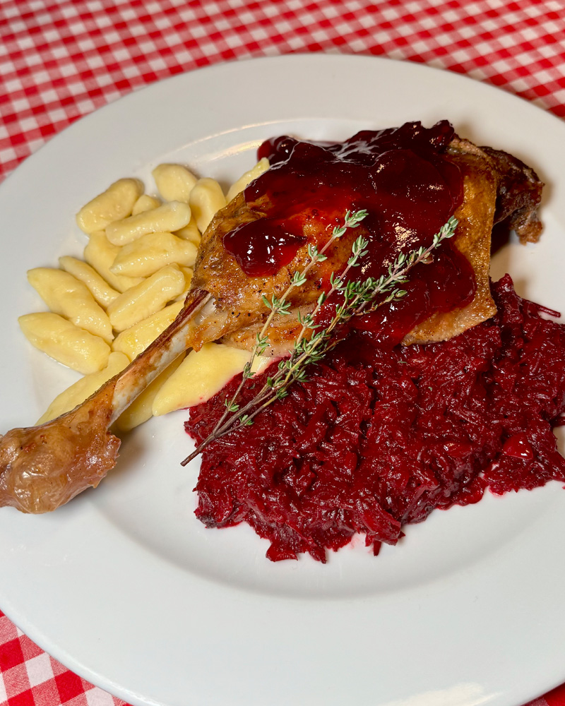 Gęsie udo podawane będzie z sosem żurawinowym, domowymi kopytkami i buraczkami na ciepło.